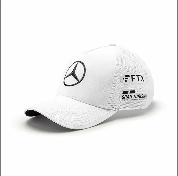 Official-style Lewis Hamilton Mercedes AMG Petronas F1 replica cap featuring breathable mesh, Mercedes star logo, sponsor detailing and an adjustable fit.