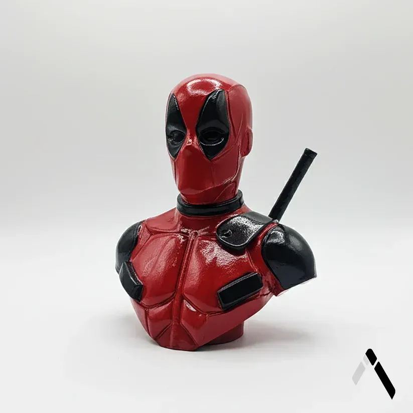 A Deadpool themed collectible bust sculpture that adds bold superhero character and personality to your desk or display space.
