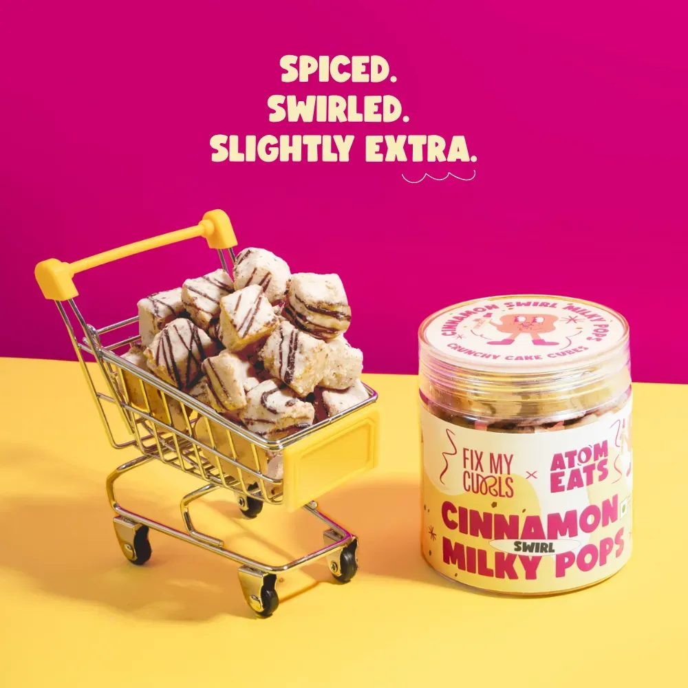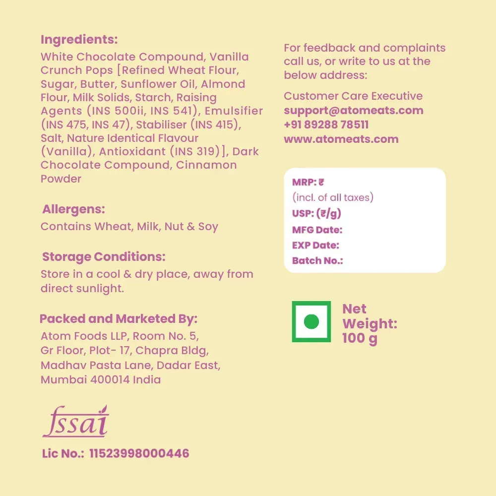 Indulge in Atom Eats' Cinnamon Swirl Milky Pops, featuring crunchy cake bites coated in white and dark chocolate, perfect for a decadent snack or coffee companion.