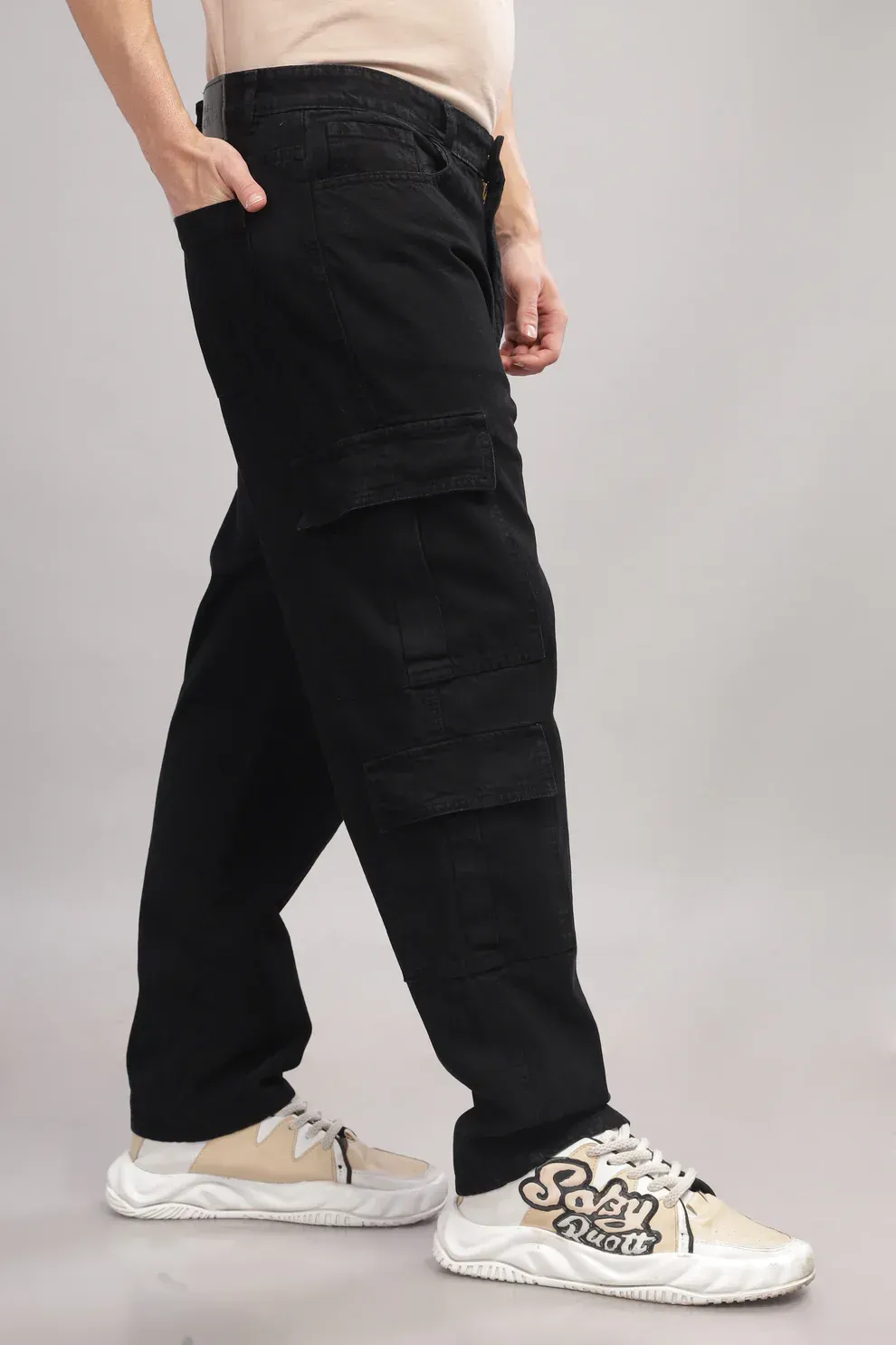 A relaxed baggy-fit black cargo denim built with 8 spacious pockets, merging utility with effortless street style. Durable, comfortable, and designed for everyday urban wear.