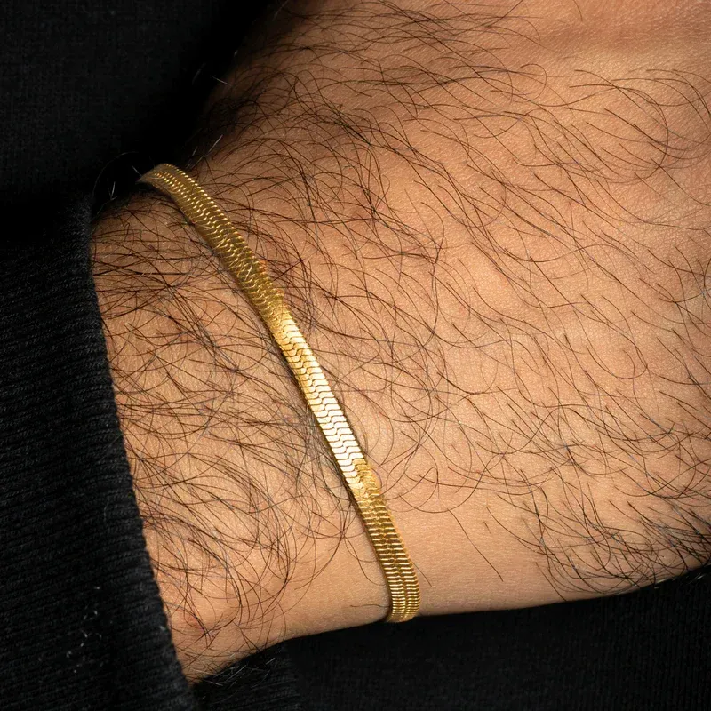 A sleek flat-snake bracelet in 18K gold vermeil — fluid, low-profile, and built to last. Adjustable between 19–21 cm, waterproof and anti-tarnish for everyday wear.