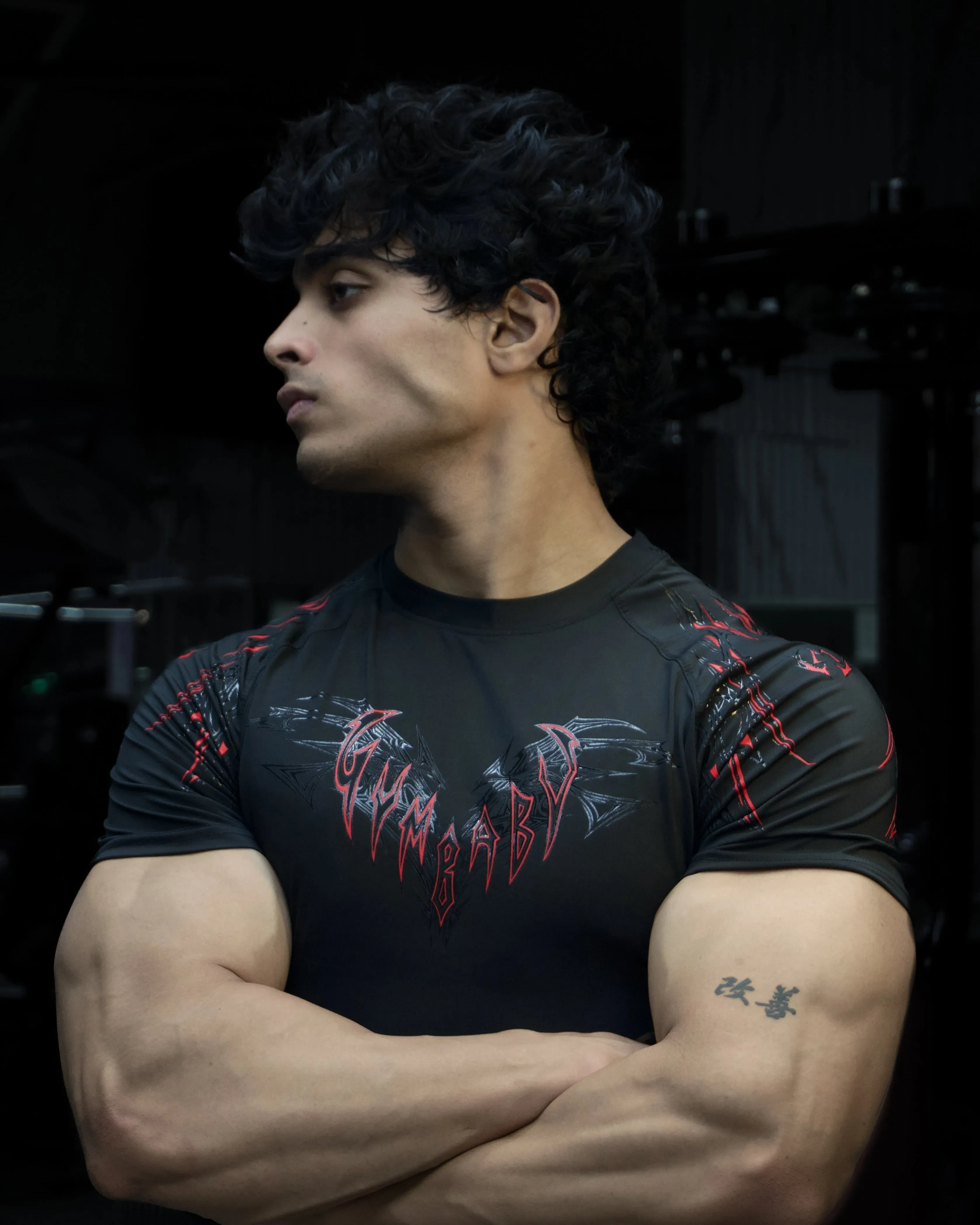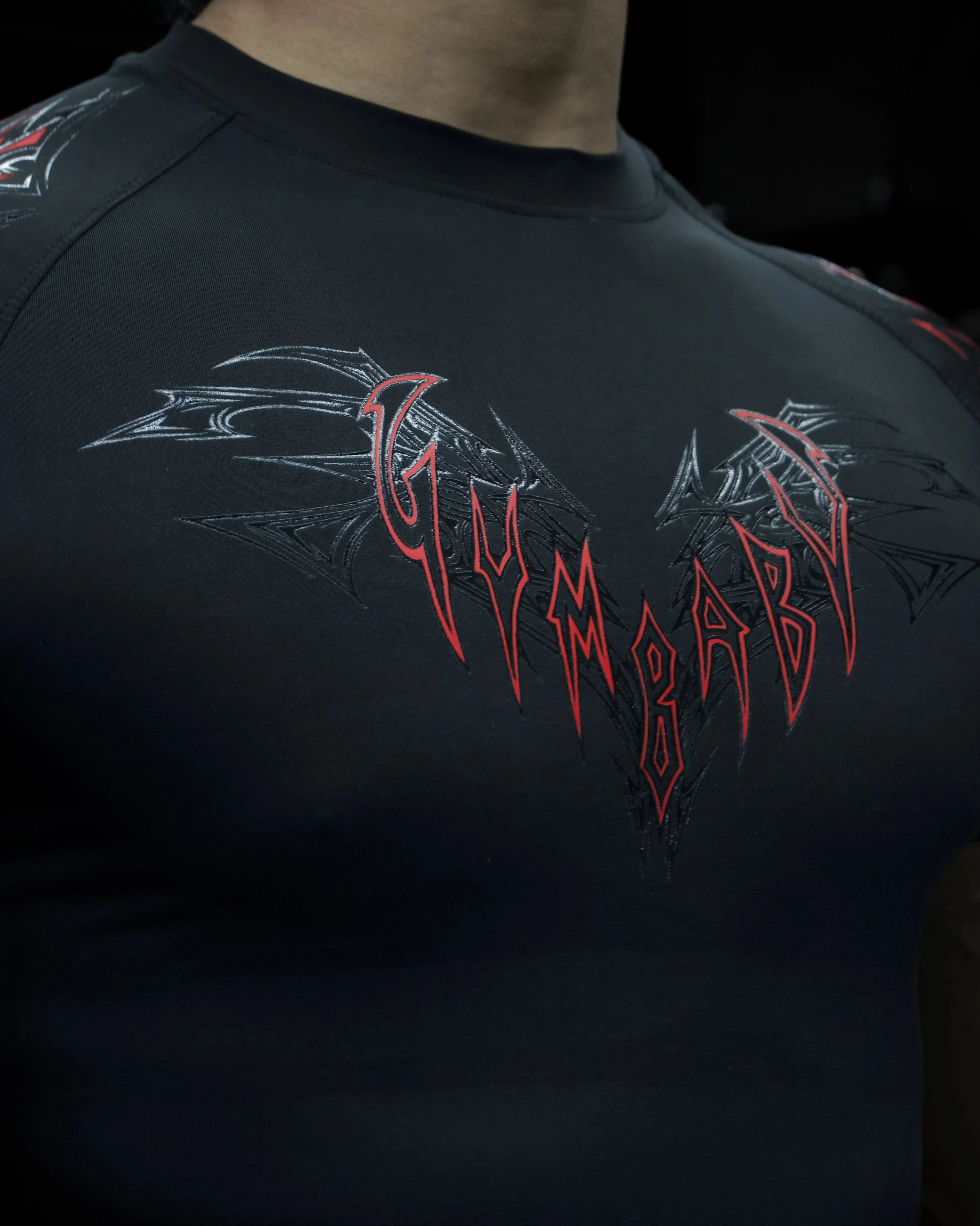 Unleash your inner antihero with this GYMBABY WarLord Lava half sleeve compression shirt, designed for peak performance and durability during intense gym workouts and fitness training.