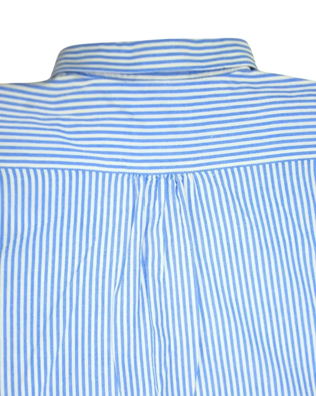 Discover this handwoven blue pinstripe long sleeve shirt made from breathable khadi, offering a vegan-friendly and contemporary fit for versatile modern tailoring.