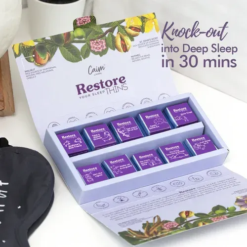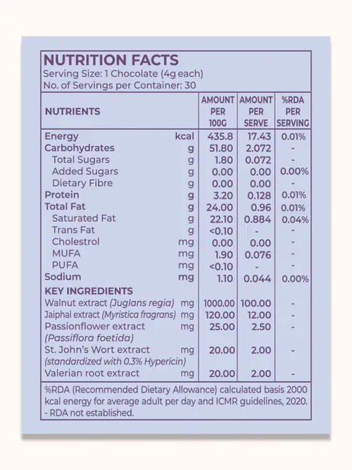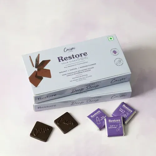 Sugar-free dark chocolate sleep squares formulated to boost natural melatonin and GABA-fast acting, non-habit forming support for deeper, more restorative sleep.