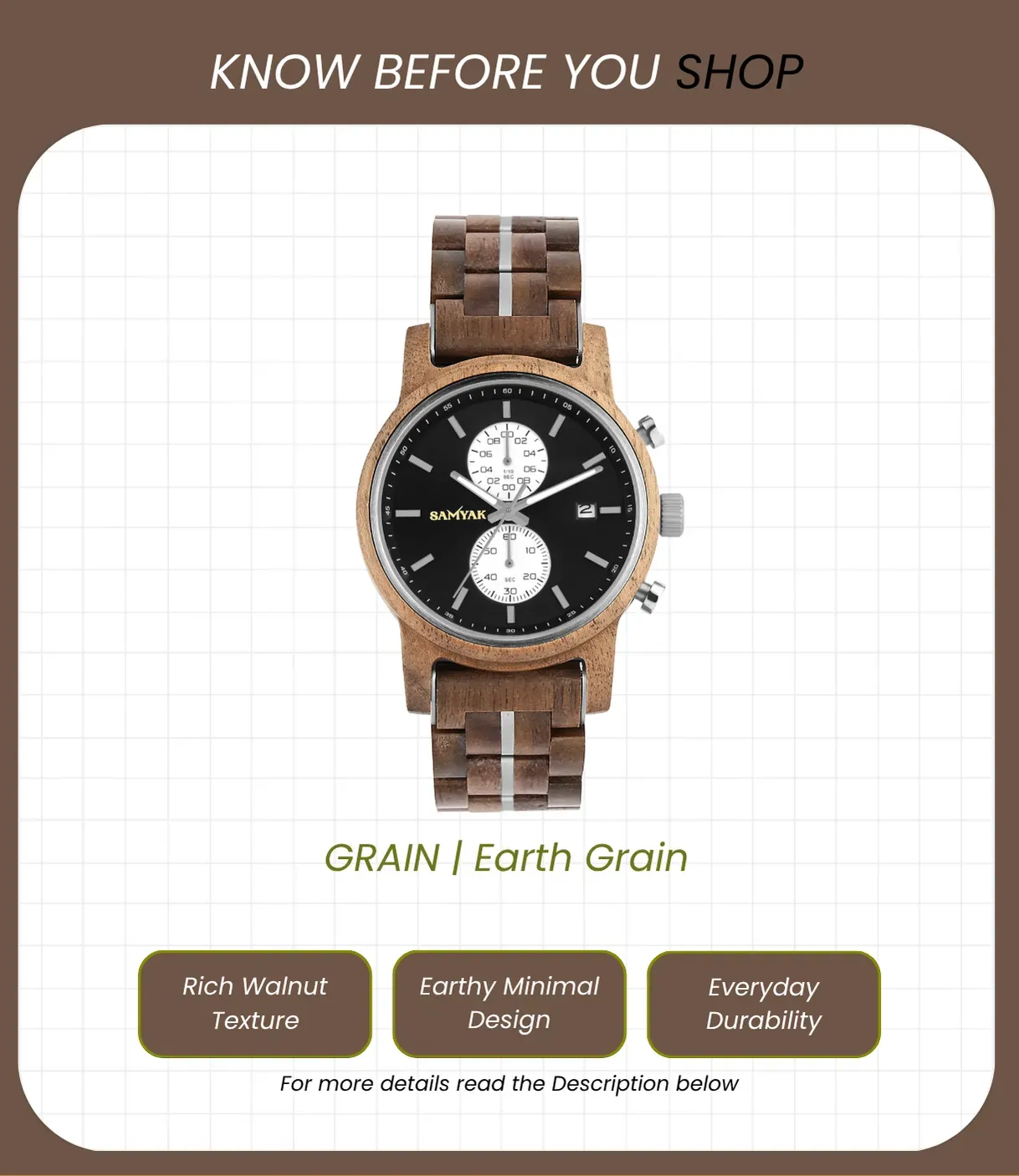 The Earth Grain watch combines natural walnut wood with precision automatic movement. Designed for everyday wear, it delivers durability, style, and individuality in one elegant design.