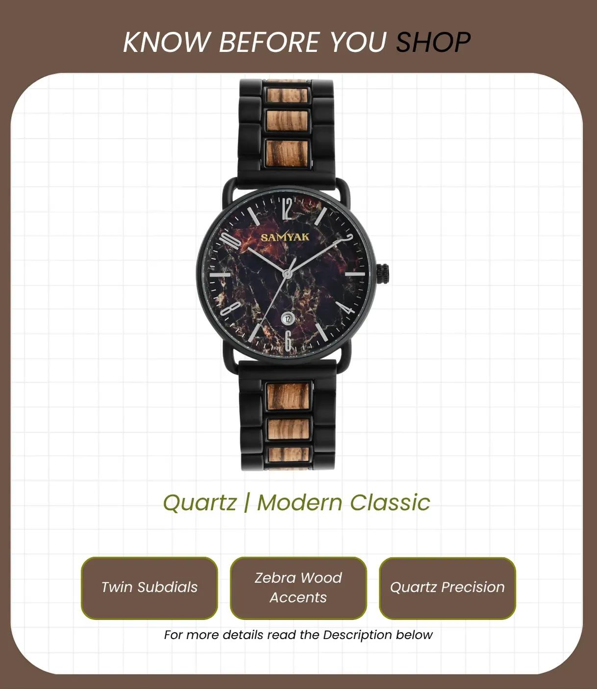 This Modern Classic watch combines alloy and zebra wood with a durable Hardlex mirror for timeless elegance. Powered by precise Japanese Quartz movement and offering daily life water resistance, it balances sharp design with practicality.